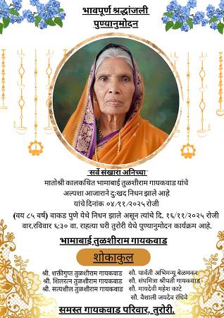 All well-wishers — Parvati Abhimanyu Belamkar, Shakti Gupta, Tulshiram Shil Ratna Gaikwad, Sangmitra Tai Shripati Gaikwad, Satyashil Tulshiram Gaikwad, Mayadevi Mahesh Kate, Vaishali Jaydev Randive, along with all relatives, supporters, and social companions — are humbly requested to attend the ceremony and offer their heartfelt tributes to the departed soul, and extend their support to the bereaved family in this hour of grief.